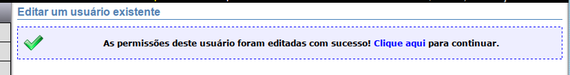 4) Salvando as informações, uma tela de sucesso irá aparecer, confirmando a operação. A partir de então, o usuário já terá acesso as permissões fornecidas ou perderá acesso às permissões revogadas.