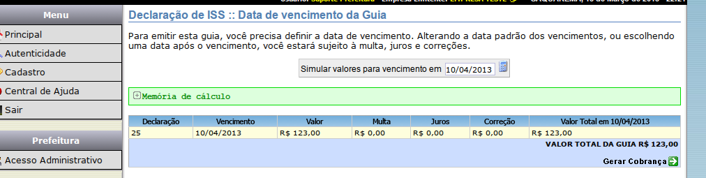 6) Selecione a data de vencimento. O sistema automaticamente irá calcular os Juros, Multa e Correções.